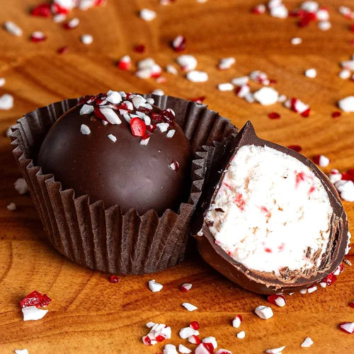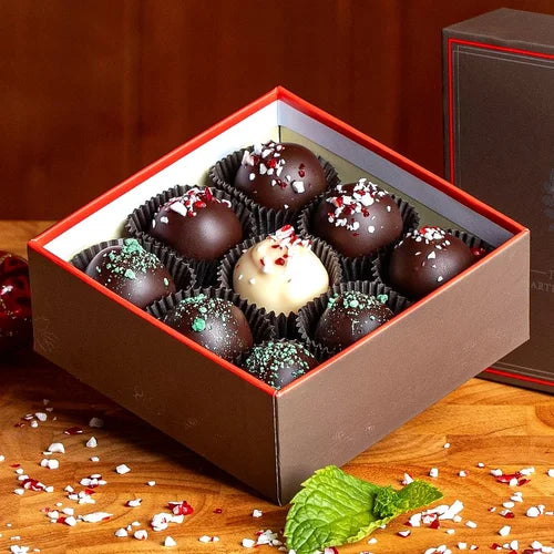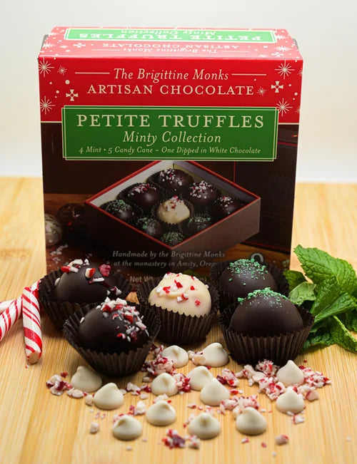 Handcrafted by Brigittine Monks at their Oregon monastery since 1986, these petite truffles represent decades of refined confectionery expertise. This nine-piece Minty Collection features four Mint and four Candy Cane truffles, each dipped in French Vanilla semi-sweet chocolate. Bite-sized yet indulgent, these silky smooth treasures deliver crisp peppermint flavor in every morsel—perfect for sharing, savoring, or gifting to those you cherish. A small-batch creation born from monastic tradition and devotion to craft.