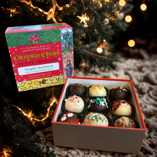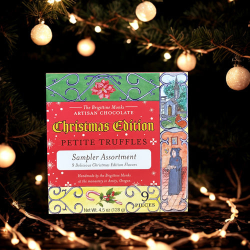 Rooted in monastic tradition since 1370, the Brigittine Monks of Amity, Oregon craft these exquisite petite truffles through generations of refined expertise. This exclusive Christmas Edition sampler showcases nine distinctive seasonal flavors: Eggnog, Macadamia Nut in White Chocolate, Butter Rum, Candy Cane, Mint, Candy Cane in White Chocolate, Gingerbread, English Toffee, and Cranberry. Each half-ounce truffle delivers silky-smooth indulgence with sophisticated flavor complexity. Handcrafted in small batches using time-honored techniques, this limited-edition collection represents the monks' commitment to culinary excellence and contemplative craftsmanship. Perfect for holiday gifting, festive gatherings, or personal enjoyment. Contains nine truffles in a 4.5 oz. box.