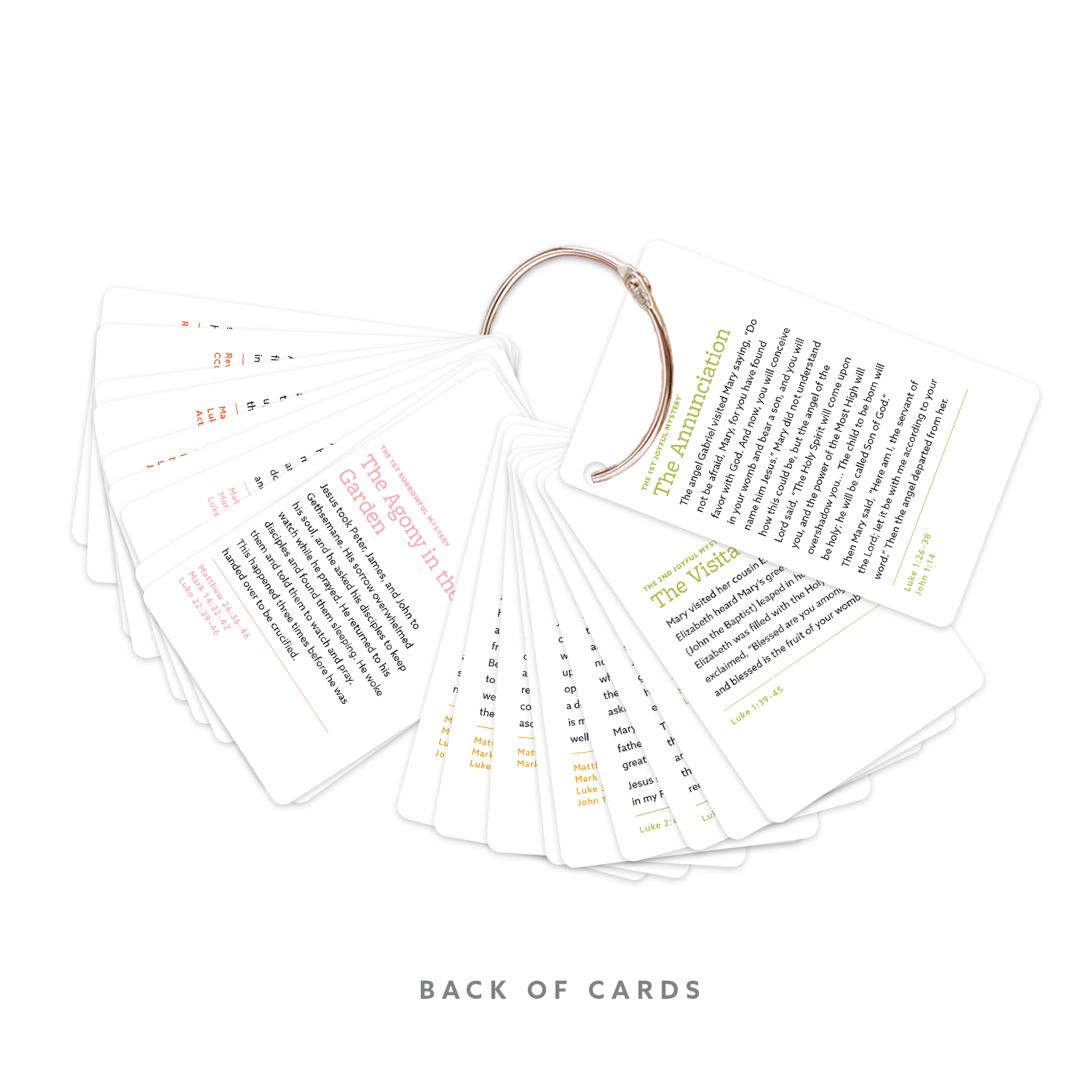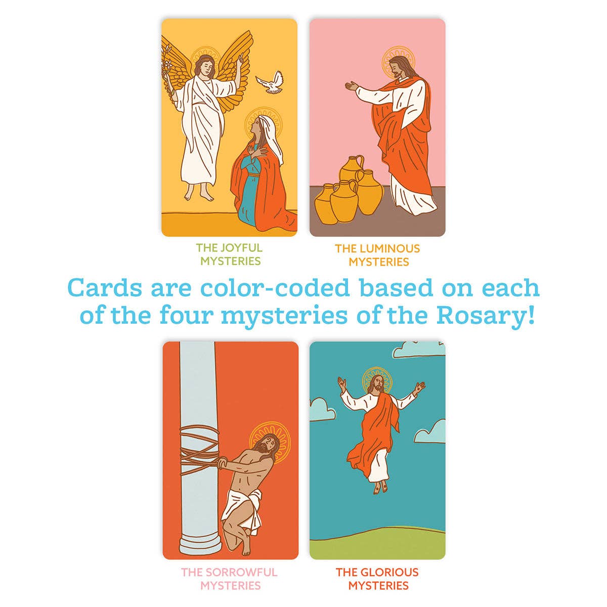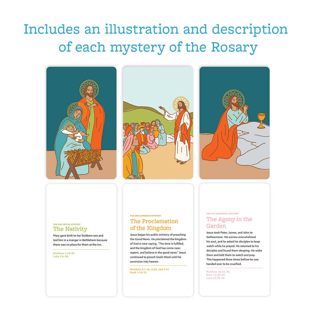TEACH YOUR KIDS THE BEAUTY OF THE ROSARY! Teaching the Rosary to your little saints can be a beautiful and meaningful journey. Our Rosary Ring: How to Pray the Rosary is designed to make this sacred practice accessible and engaging for children and families. Easy-to-Follow Guide This pocket-sized Rosary Ring features 27 cards that vividly depict the Joyful, Luminous, Sorrowful, and Glorious Mysteries of the Rosary through hand-drawn illustrations in vibrant colors. Each card offers a simple meditation and scripture references to deepen your understanding of the Mysteries. The set also includes a detailed guide on how to pray the Rosary, breaking it down into easy-to-follow steps. Each part of the Rosary is clearly explained, making it accessible and engaging for both children and adults. ⭐️⭐️⭐️⭐️⭐️ “Beautiful and easy to follow rosary cards. Perfect stocking stuffer for my 8-year old daughter." - Caitlin Simple and Convenient The Rosary Ring is a pocket-sized, portable tool that allows you to bring