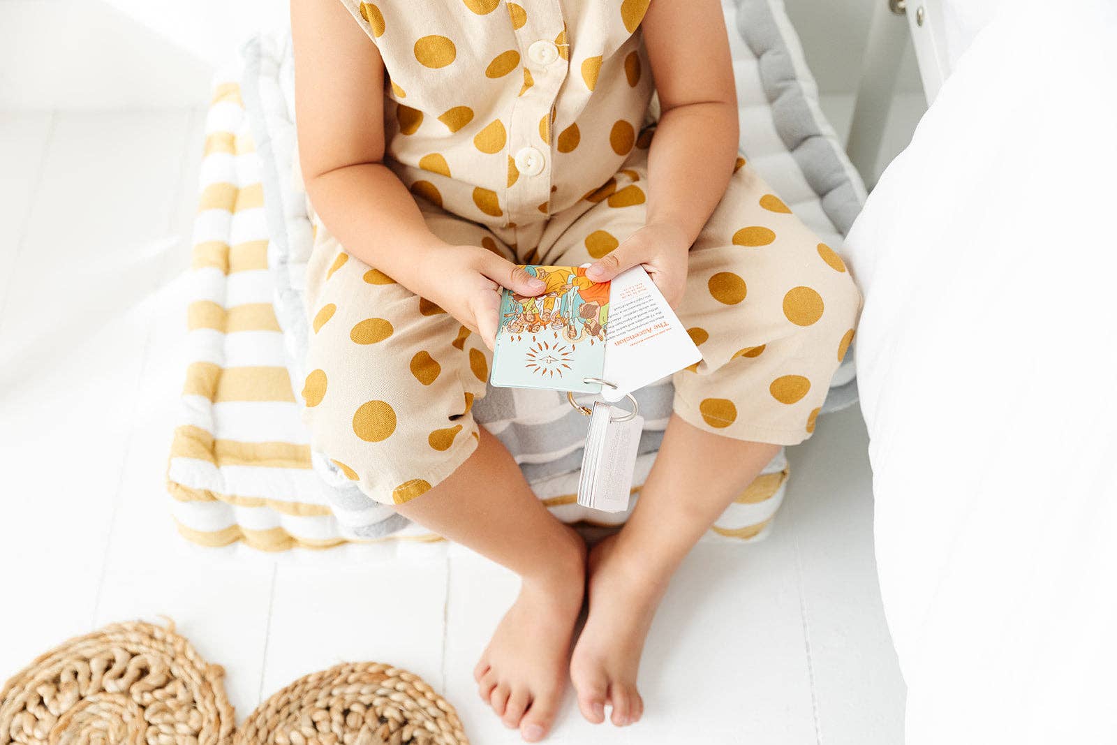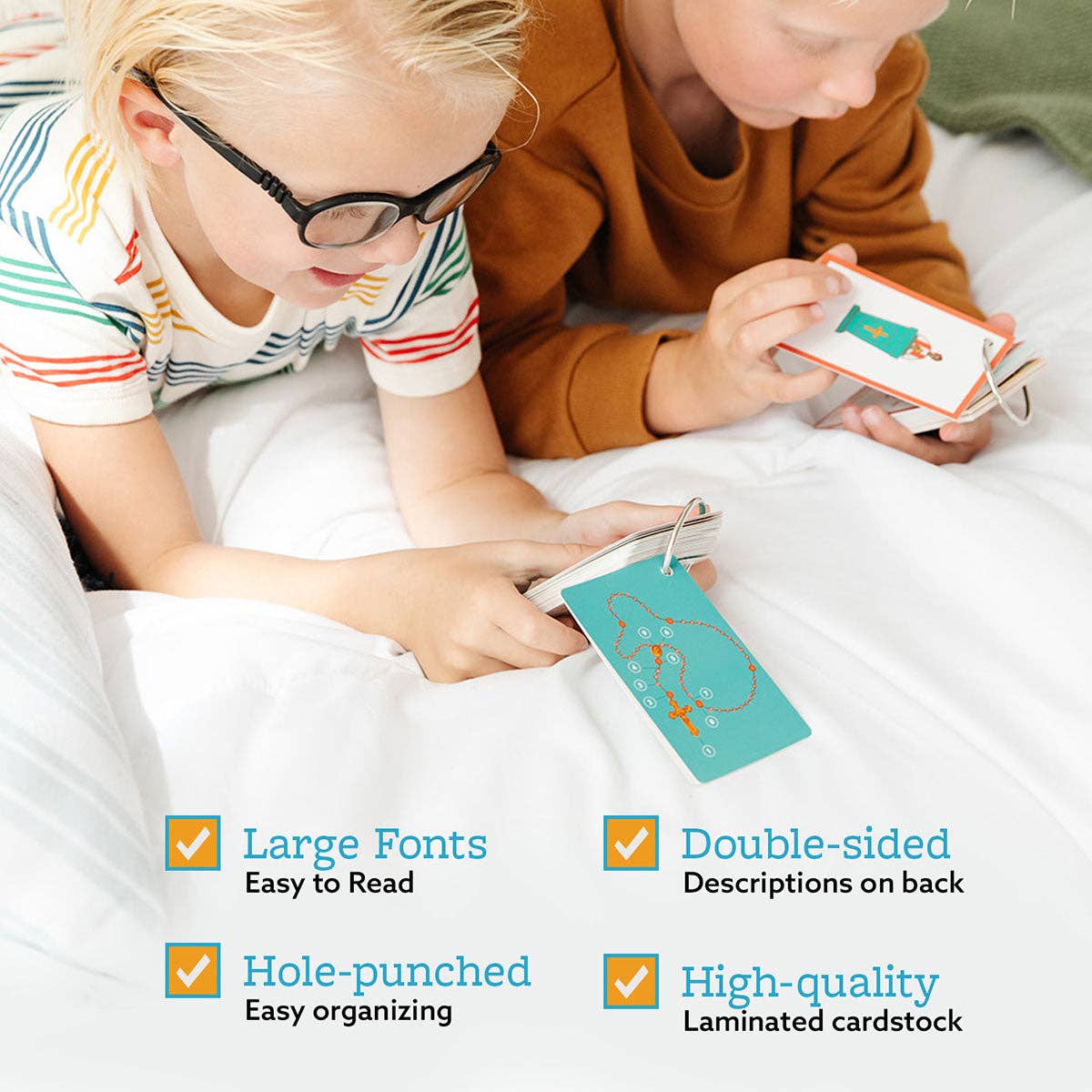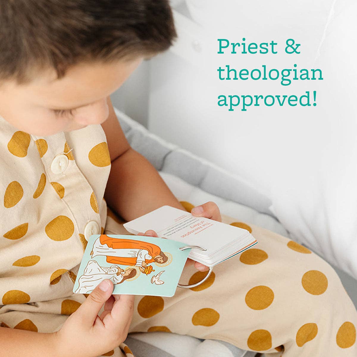 TEACH YOUR KIDS THE BEAUTY OF THE ROSARY! Teaching the Rosary to your little saints can be a beautiful and meaningful journey. Our Rosary Ring: How to Pray the Rosary is designed to make this sacred practice accessible and engaging for children and families. Easy-to-Follow Guide This pocket-sized Rosary Ring features 27 cards that vividly depict the Joyful, Luminous, Sorrowful, and Glorious Mysteries of the Rosary through hand-drawn illustrations in vibrant colors. Each card offers a simple meditation and scripture references to deepen your understanding of the Mysteries. The set also includes a detailed guide on how to pray the Rosary, breaking it down into easy-to-follow steps. Each part of the Rosary is clearly explained, making it accessible and engaging for both children and adults. ⭐️⭐️⭐️⭐️⭐️ “Beautiful and easy to follow rosary cards. Perfect stocking stuffer for my 8-year old daughter." - Caitlin Simple and Convenient The Rosary Ring is a pocket-sized, portable tool that allows you to bring