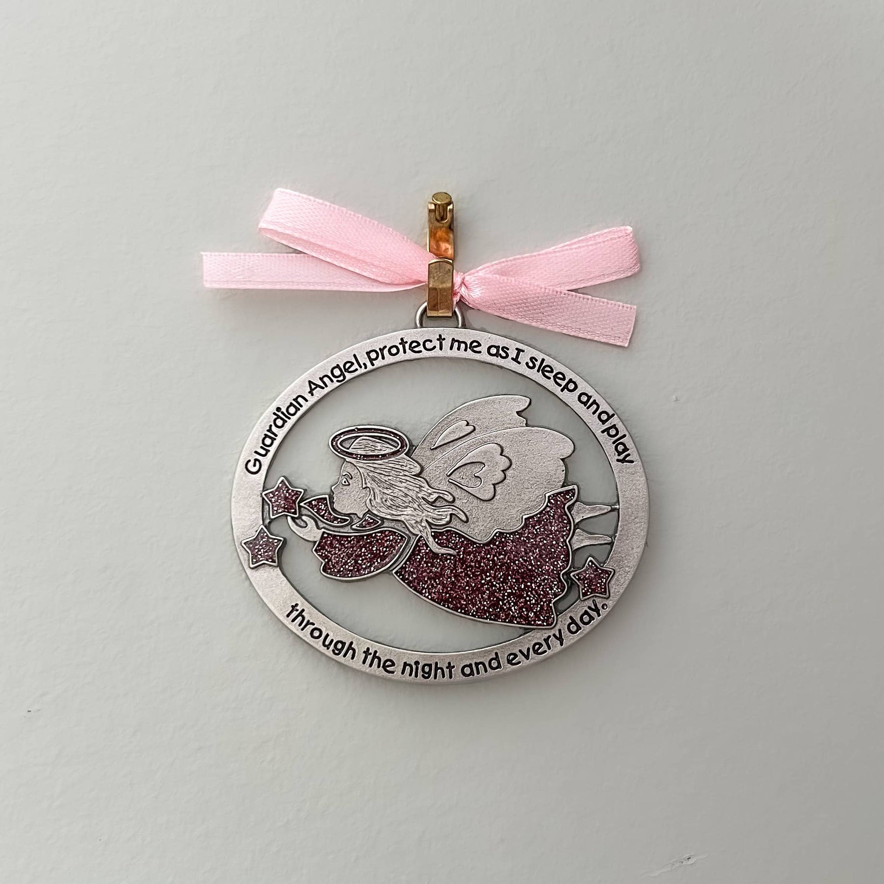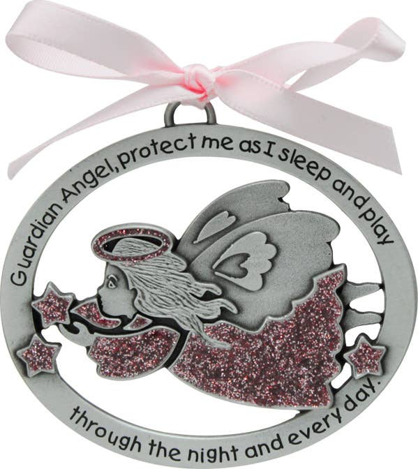 Angel crib medal in silver enamel finish w/sparkling pink epoxy & soft pink ribbon, etched prayer for protection: Guardian Angel, protect me as I sleep and play through the night and every day.
